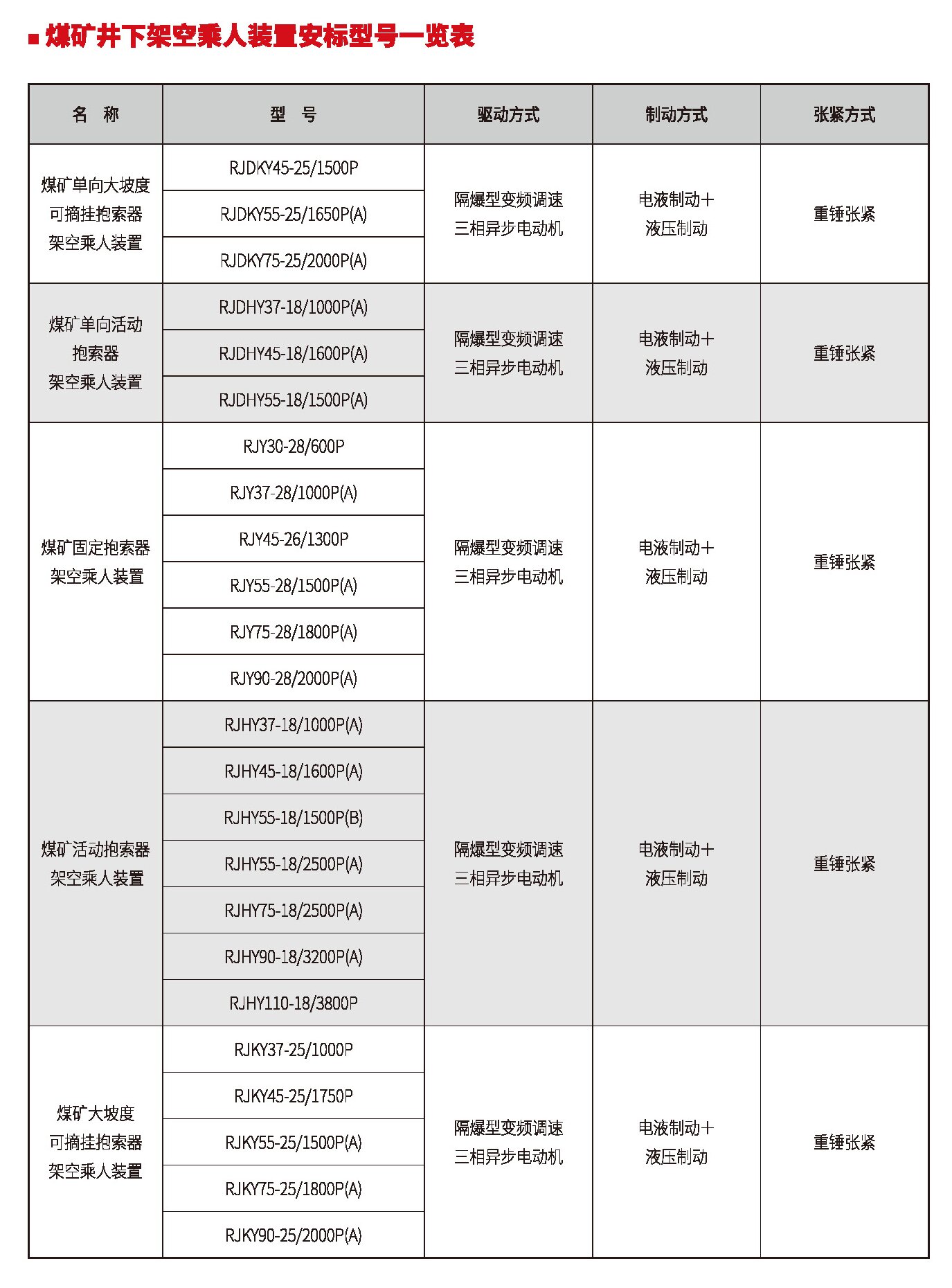 煤礦井下架空乘人裝置安標型號一覽表